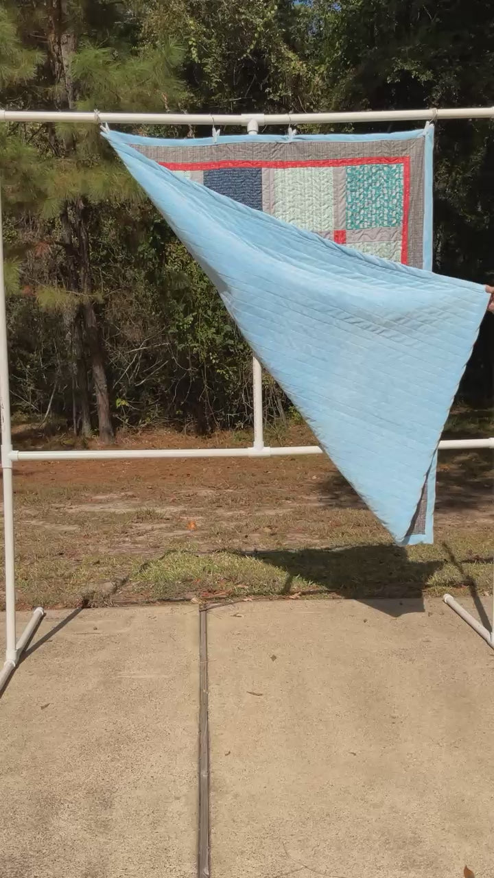 BLUEY and BINGO appliqués adorn the front of this one of a kind quilt. This quilt is made with designer cotton fabric on the front. 100% cotton batting is used so the blanket can breathe and soft, cuddly baby blue minky is used on the back.
